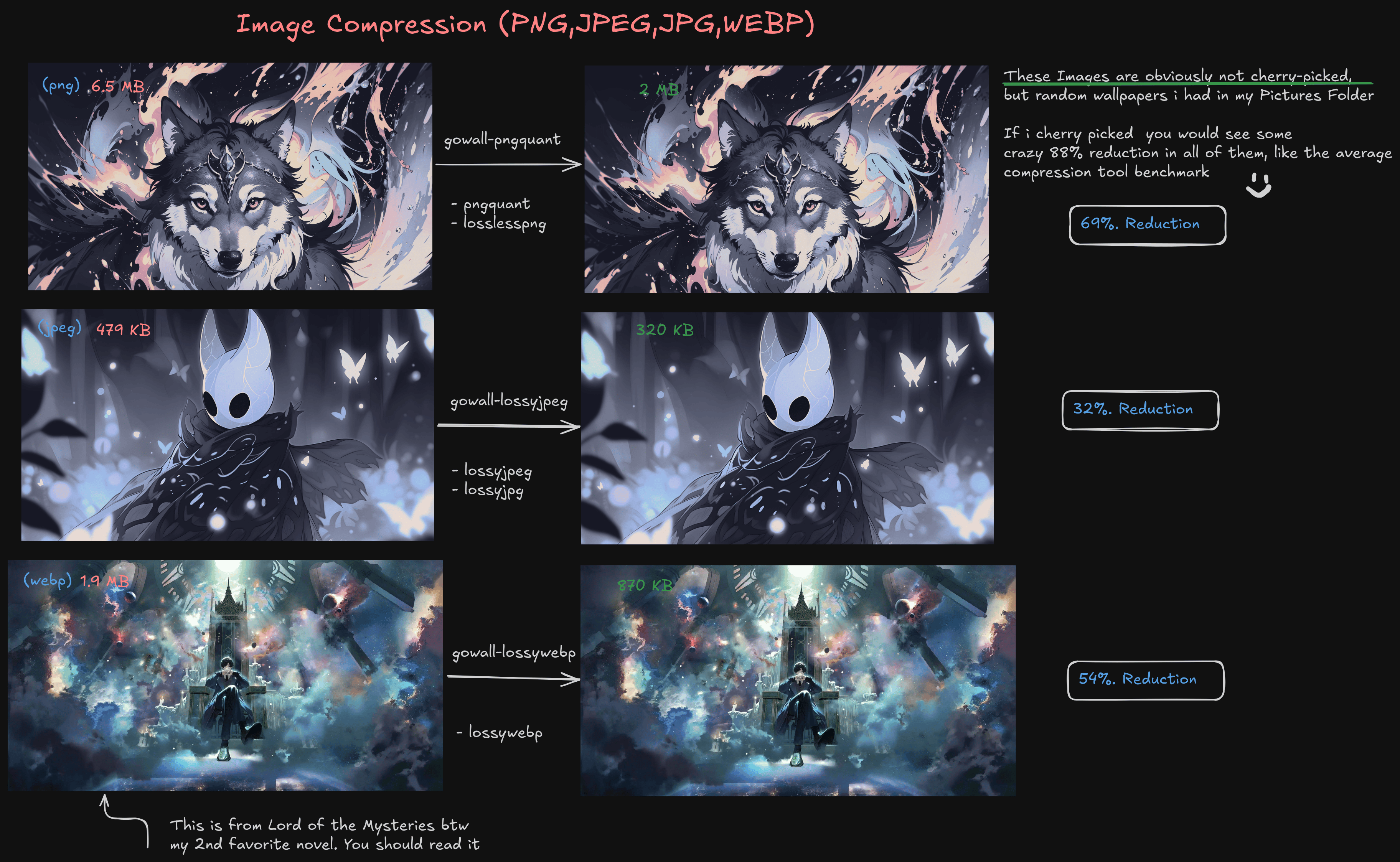 Image compression reduces the size of images by reducing the amount of data required to represent the image while visually staying the same. Gowall supports png